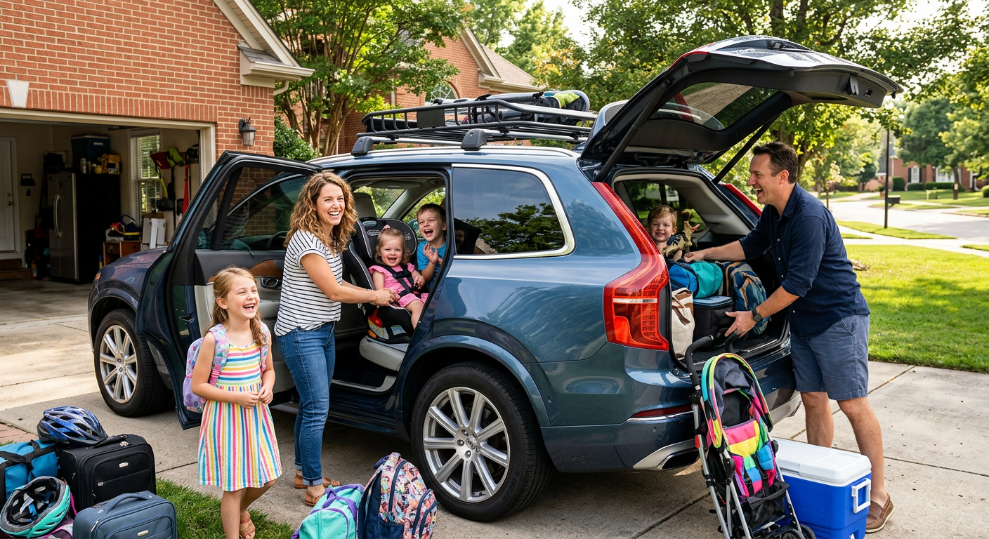 Smiling young girl sitting in a car seat inside a vehicle, next to a beige car backseat.